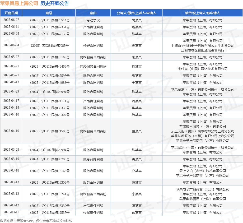 案号:(2025)沪0115民初44983号审理法院:上海市浦东新区人民法院案由:服务合同纠纷当事人信息: 原告/上诉人:王某某 被告/被上诉人:苹果贸易(上海)有限公司开庭日期:2025年5月13日根据统计,近一年内以苹果贸易(上海)有限公司为当事人的历史开庭公告有79则,其中案由为“服务合同纠纷”的公告以43则居首,其次为“网络服务合同纠纷”有14则,“产品责任纠纷”有11则。历史开庭公告(前20条)如下: