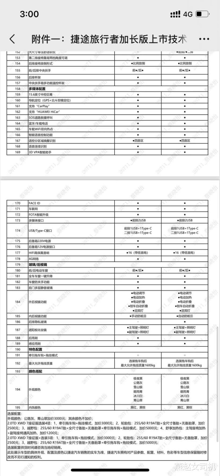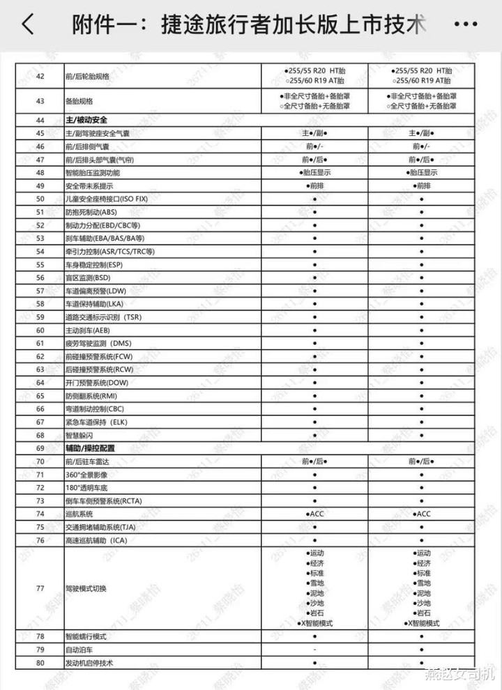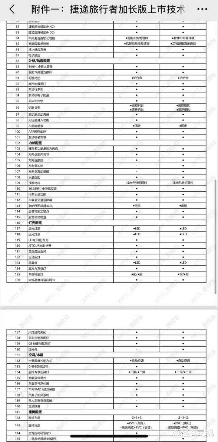 另据曝光的配置信息来看,捷途旅行者加长版还将标配64英寸全景天窗、氛围灯、16扬HIFI高保真音响、前门多层静音玻璃、外后视镜电动调节/加热/锁车自动折叠/迎宾灯以及自动三区空调等舒适配置,以及包含ACC巡航系统、主动刹车、车道保持、540°全景影像等在内的智驾系统。另外,7座征服+版本还将升级自动泊车、方向盘加热、后排隐私玻璃、香氛系统、灯光秀等配置。